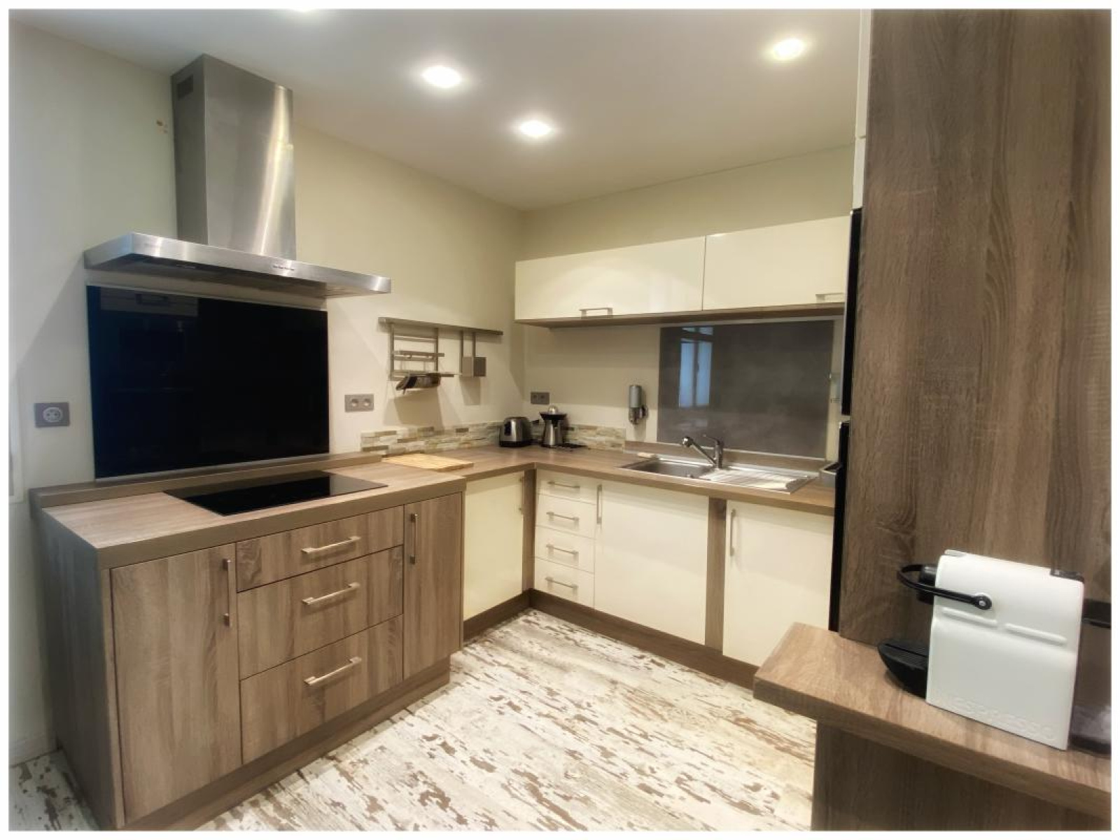 Cuisine entièrement équipée : plaques de cuisson, hotte aspirante, four, réfrigérateur et congélateur américain, micro-onde – tout pour cuisiner en toute sérénité.